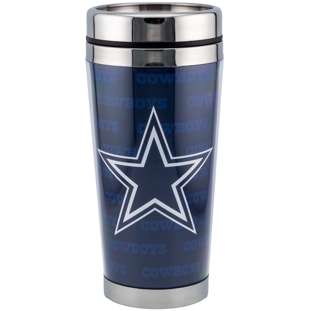 Sleek metal double-walled thermal travel mugFeaturing the Dallas Cowboys logo and text in a vibrant wrap around...