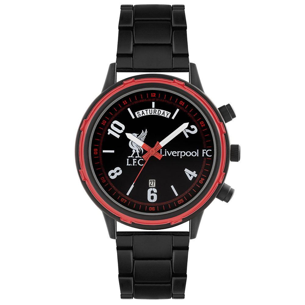 Mens analogue watch with a black face, white digits and red and white handsFeaturing a white LFC...